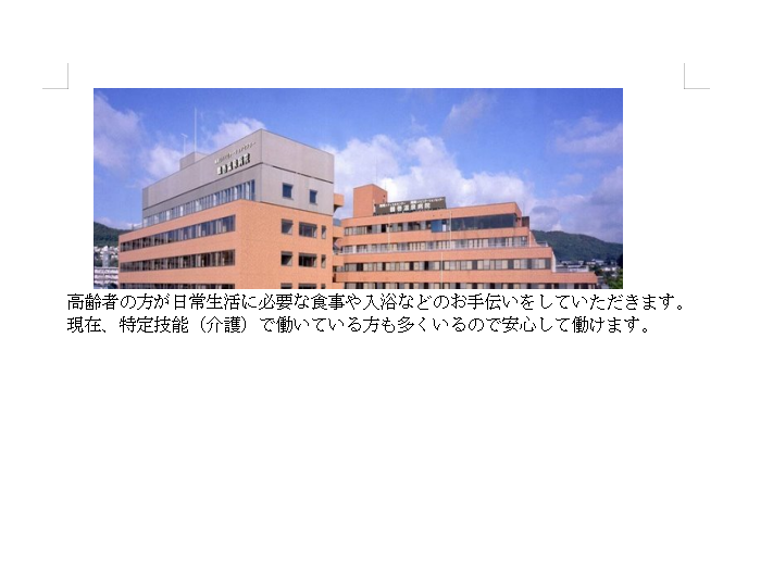 | 職務内容 | 入院している患者さまの看護補助業務(介護業務) ・入浴介助、食事介助、排泄介助、環境整備他 |